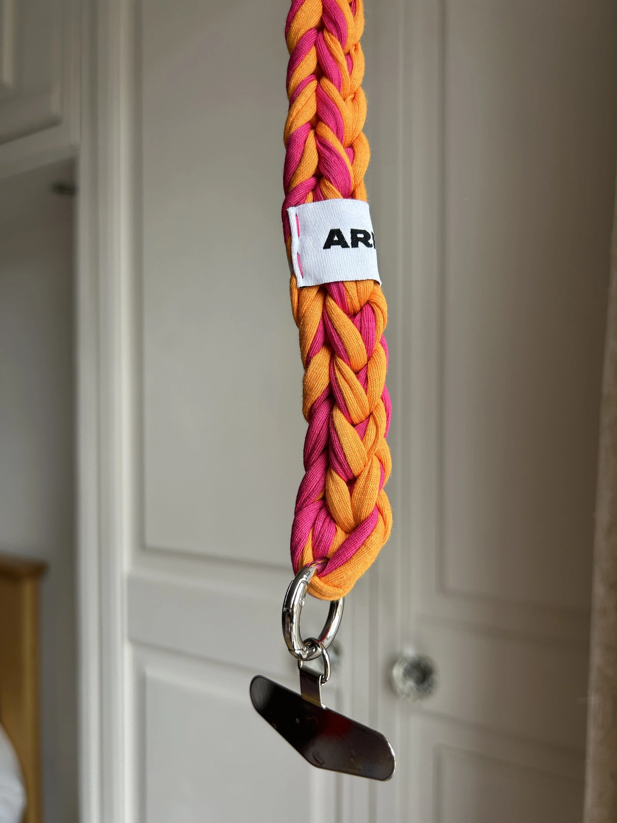 Every Ariadne phone strap is handmade using unique colour combos of stretchy recycled T-shirt yarn, so every purchase is one of a kind and saves materials from landfill!